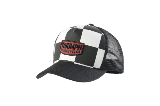 Model de casquette noir a carreau blanc. Ce modèle propose le logo Triumph Motorcycles brodé sur fond rouge à l’avant.